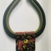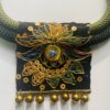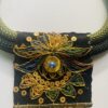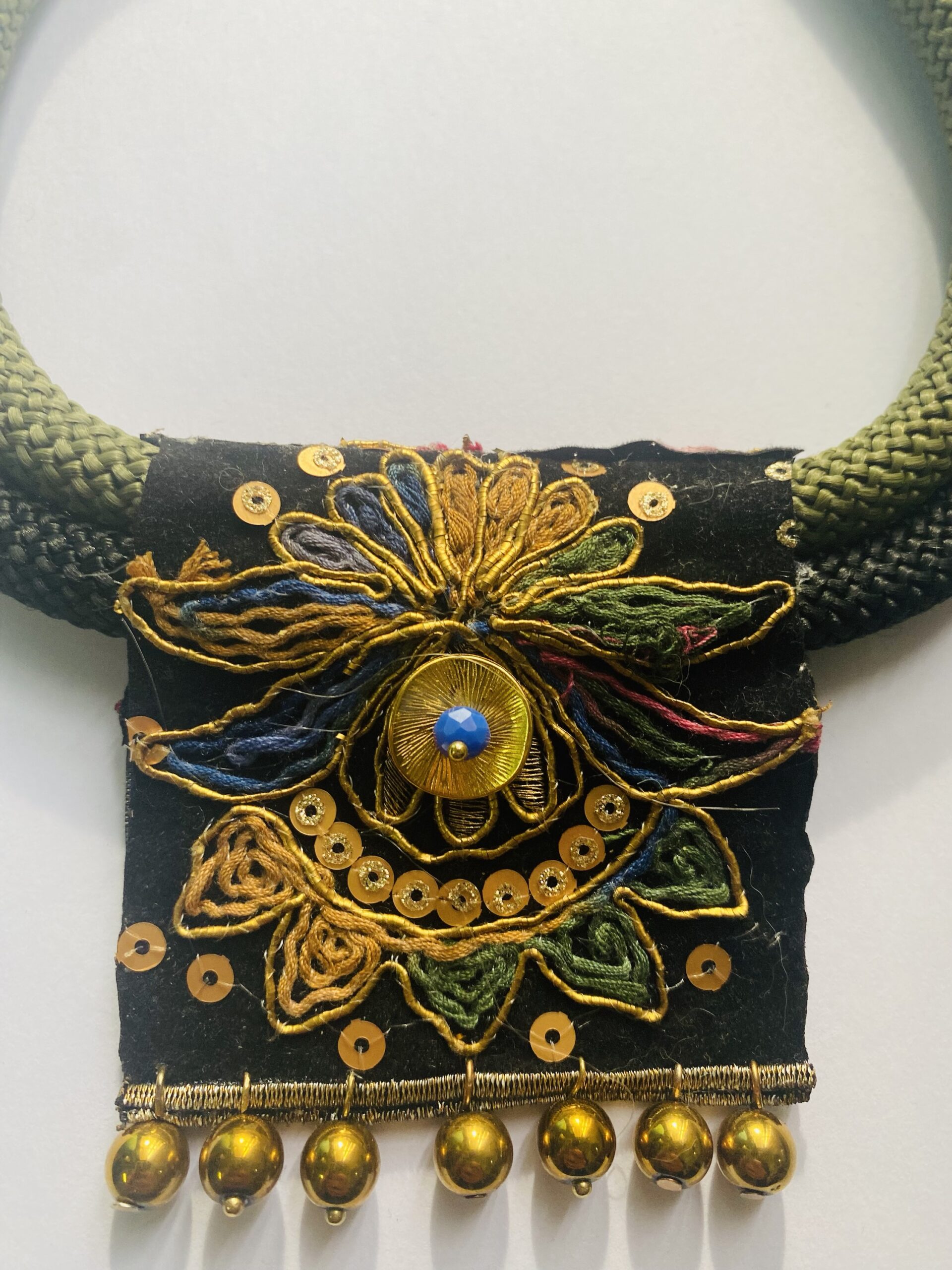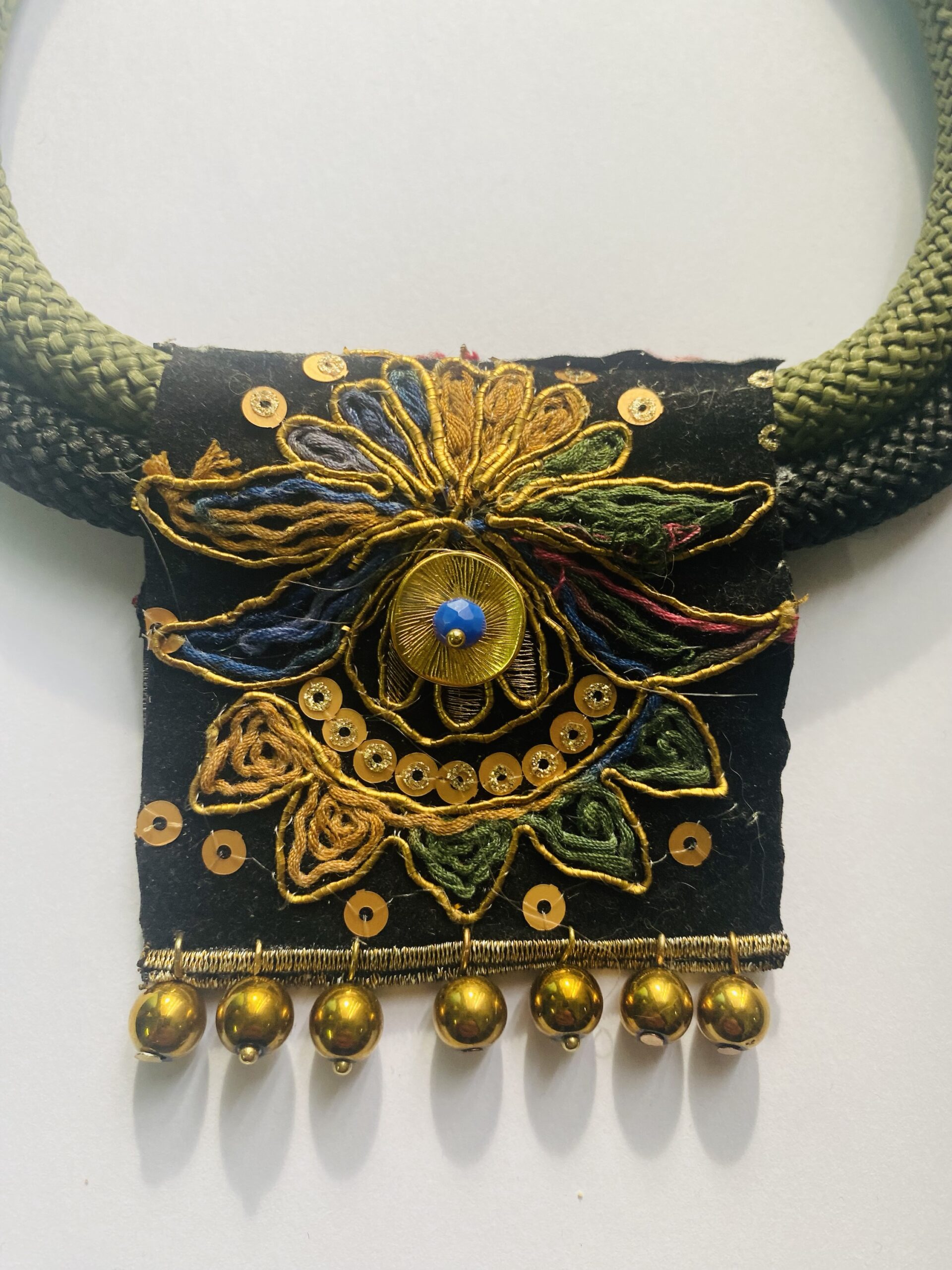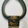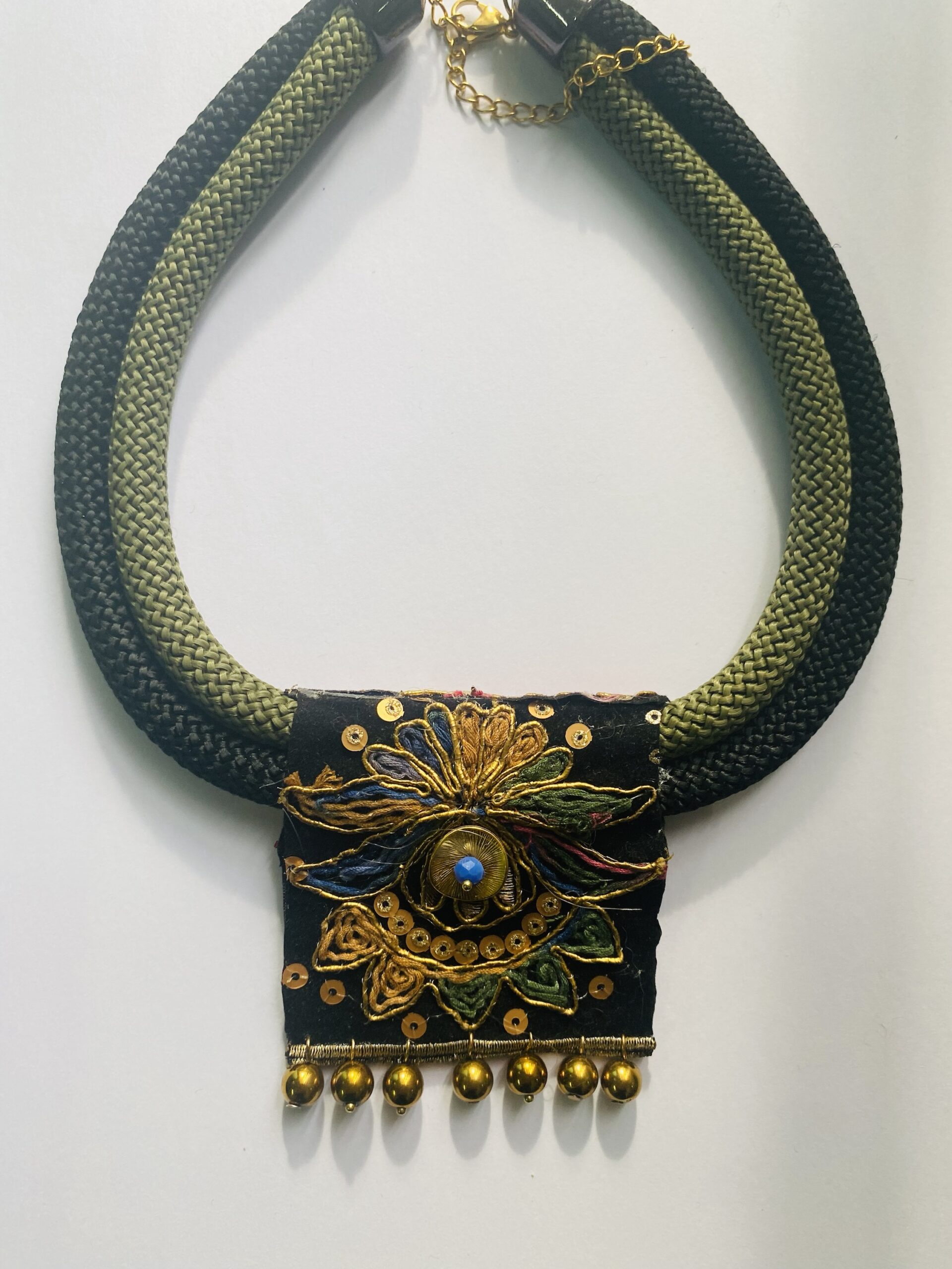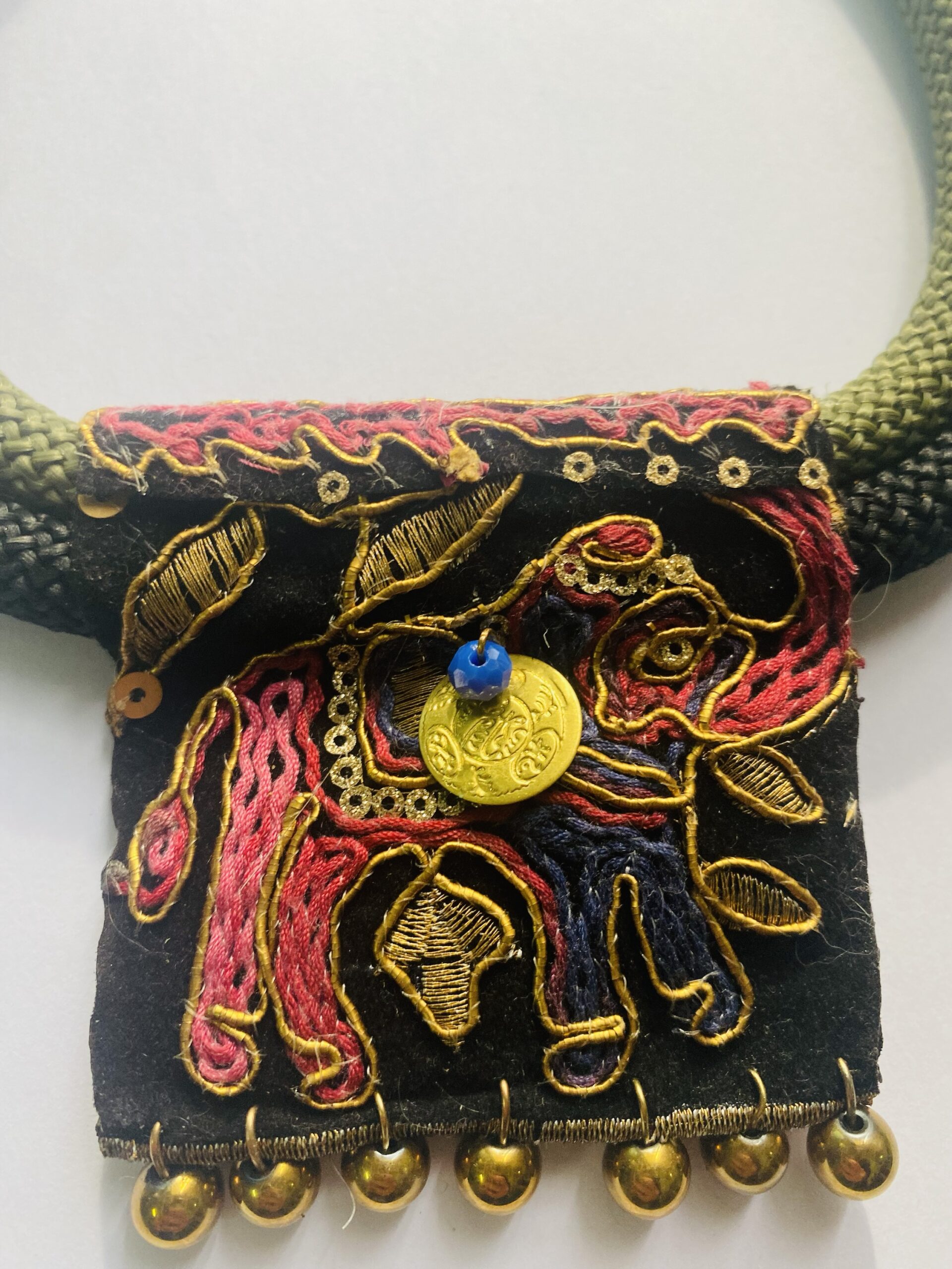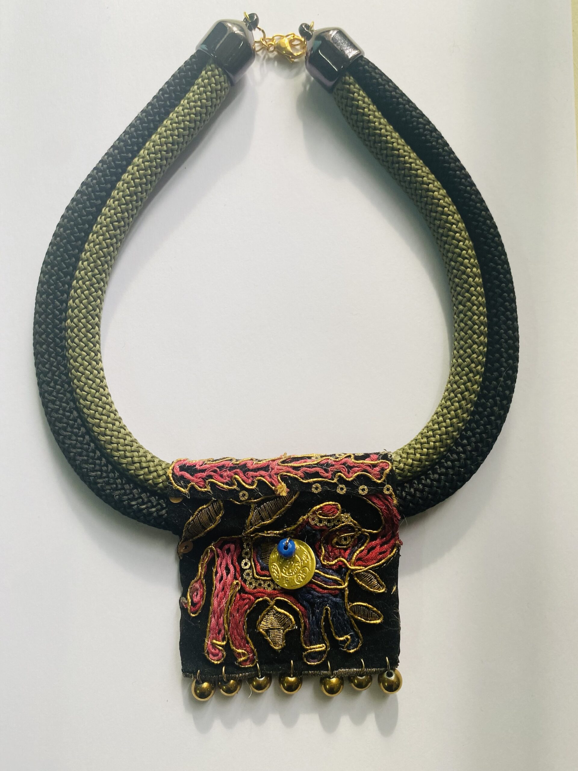 Ένα εντυπωσιακό κολιέ φτιαγμένο με μία Ινδική τρέσα που απεικονίζει από τη μία μεριά εναν λωτό και από την άλλη έναν ελέφαντα. Φοριέται και από τις δύο μεριές. Δεμένη πάνω σε ορειβατικά κορδόνια και στολισμένη με χάντρες αιματίτη και μεταλλικά στοιχεία.